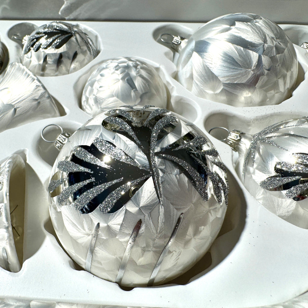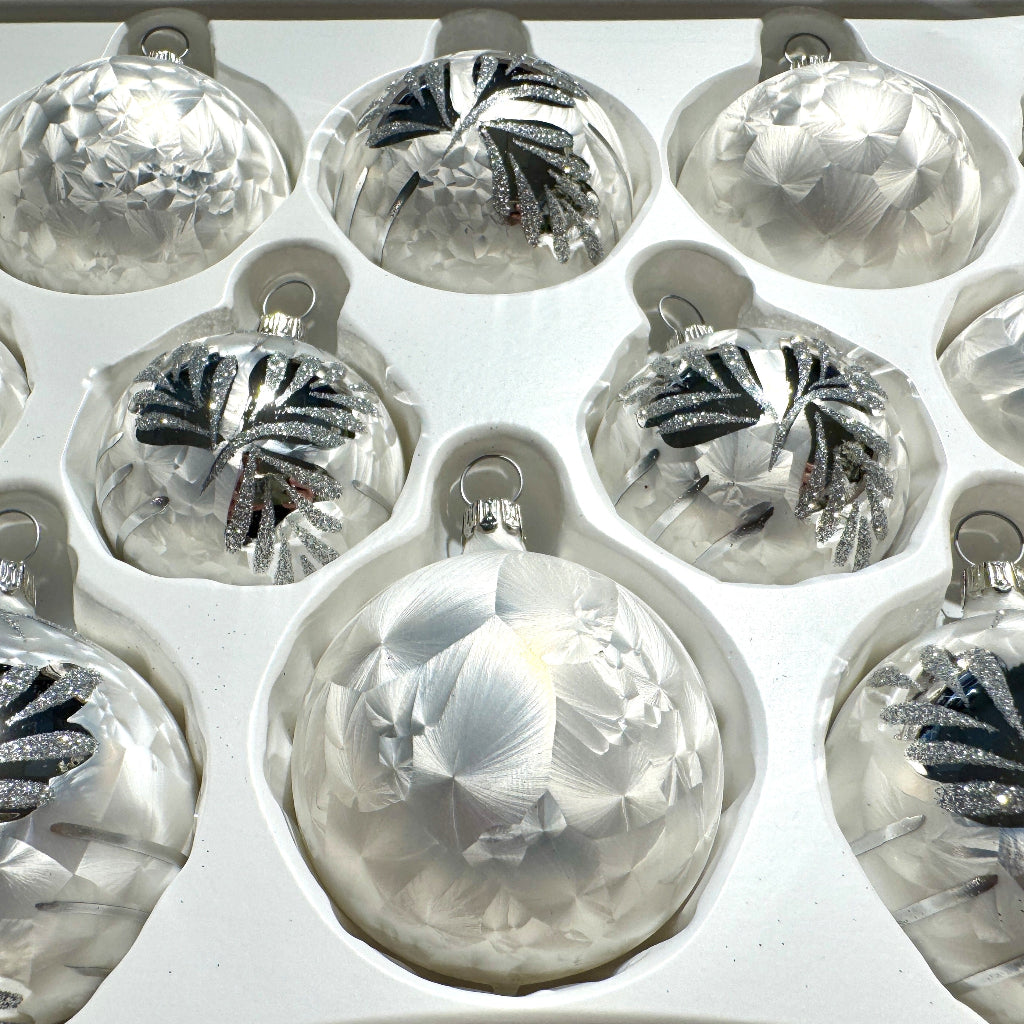 Diese weiß gefrosteten Weihnachtskugeln vereinen Tradition und Eleganz in Harmonie. Die Glaskugeln sind mit einem altdeutschen Dekor, dem Blatt der Eiche, handdekoriert.
